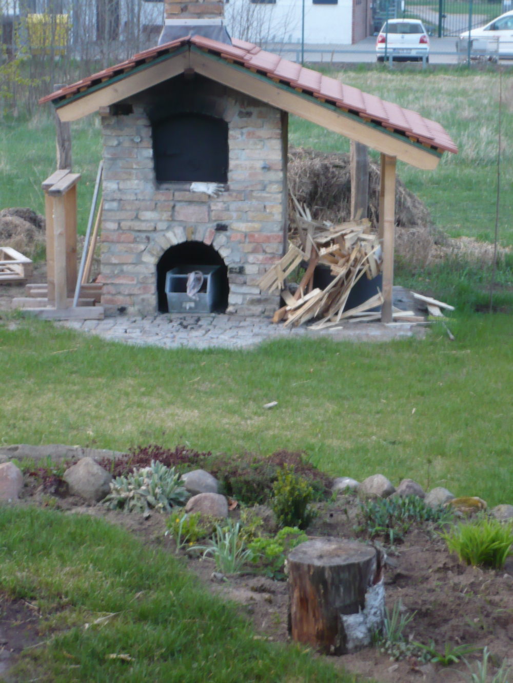 So, nun ml ein Bild mit Einbau. Die Dacheindeckung ist auch bereits länger fertig. Es fehlen noch: Kaminhaube, Blenden entlang dem Giebel, und einige Ausbesserungsarbeiten am Mauerwerk sowie die Firstziegel. Liegt alles bereit, und wenn Zeit ist, könnte das Ganze dieses Wochenende klappen.