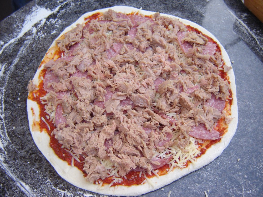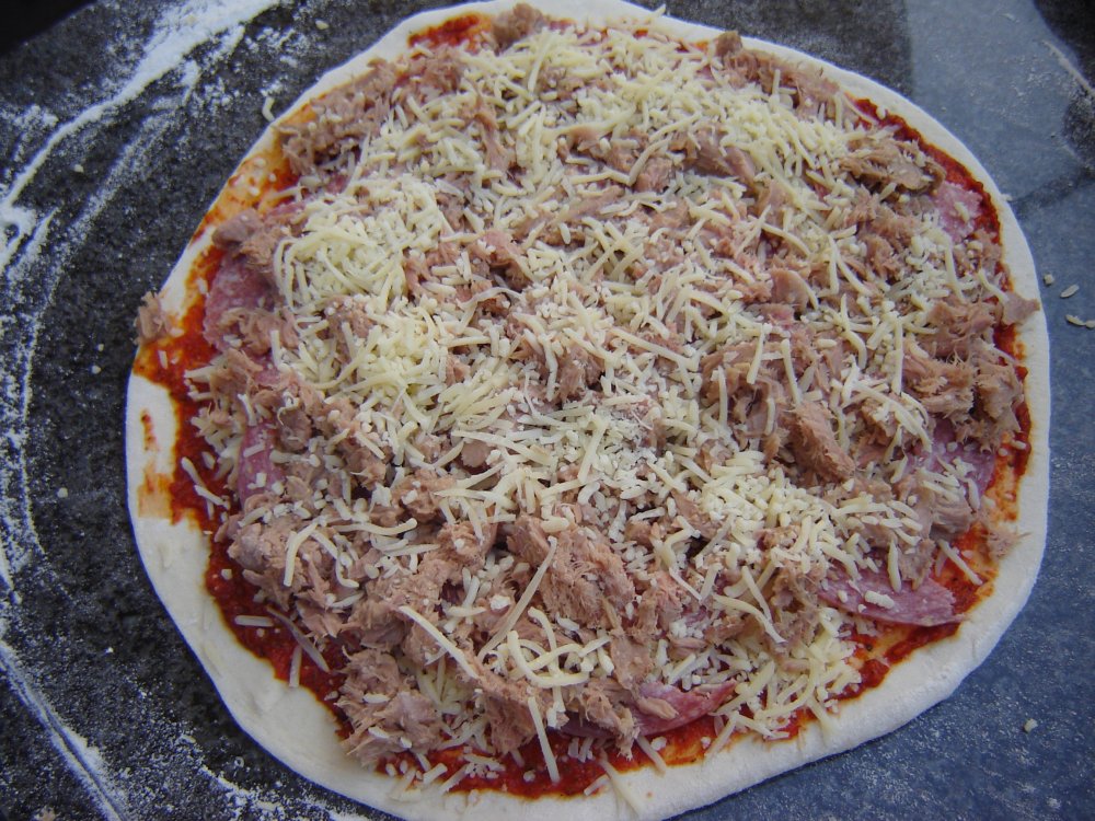 Danach Pizza beliebig belegen.