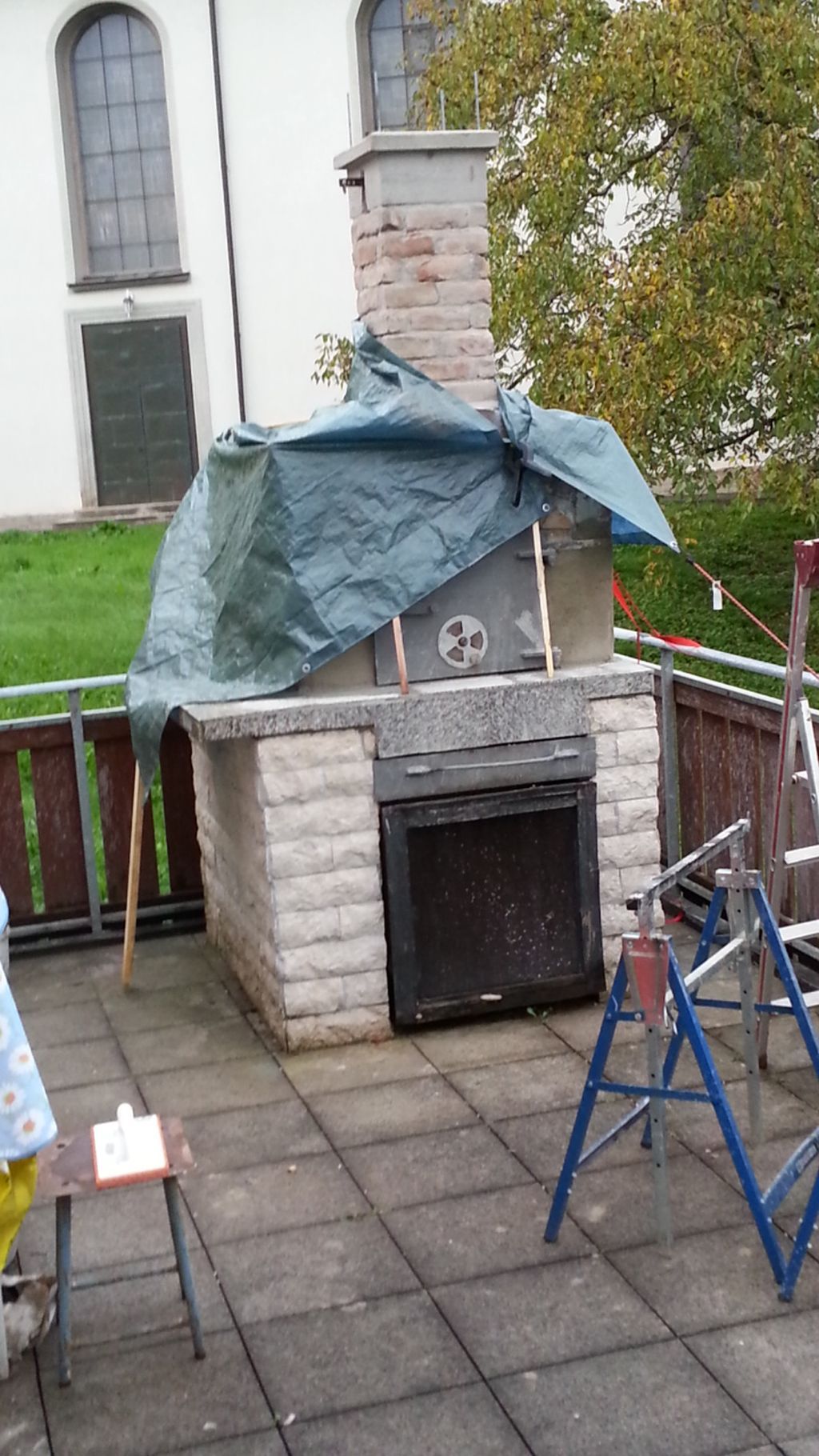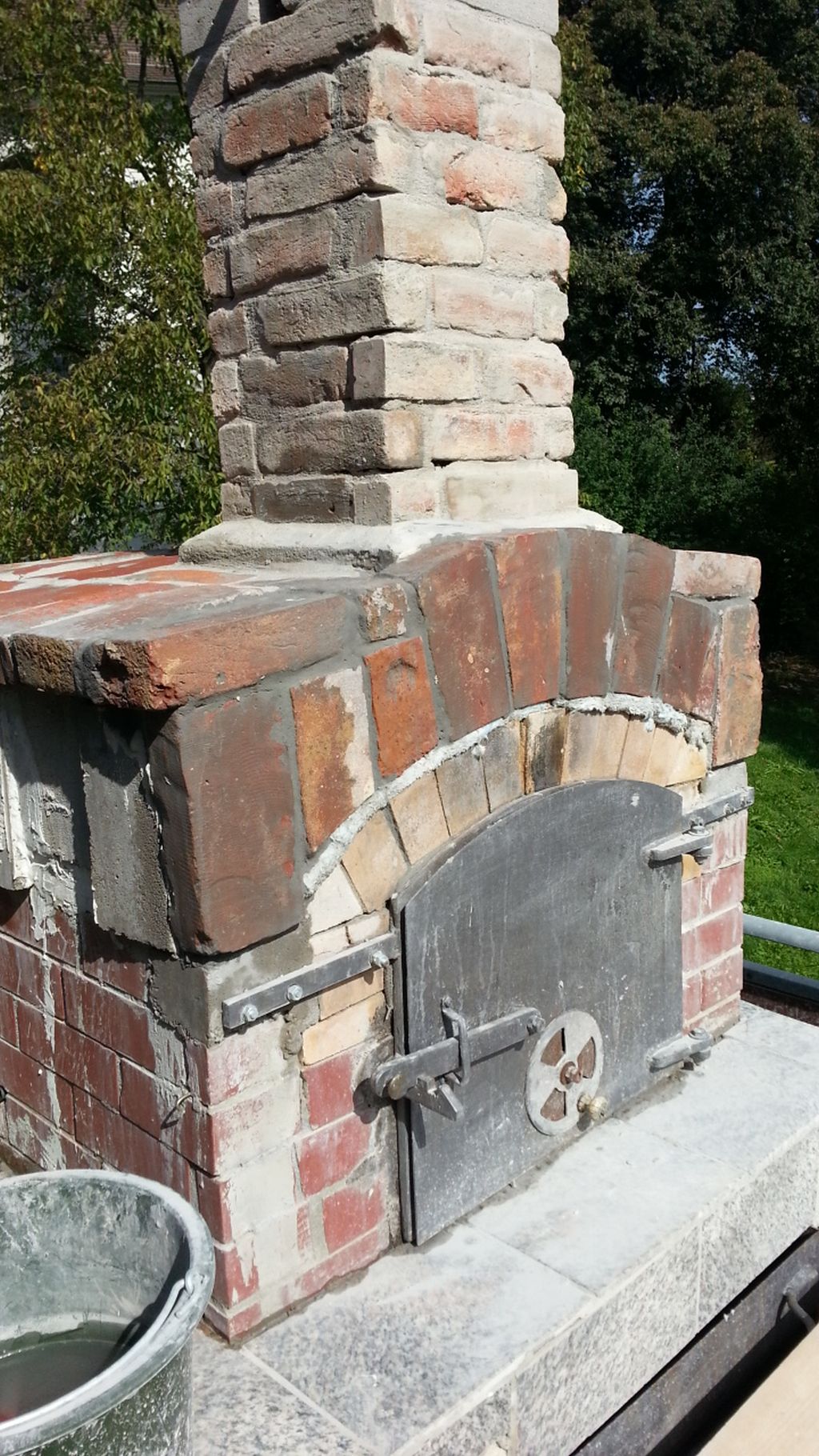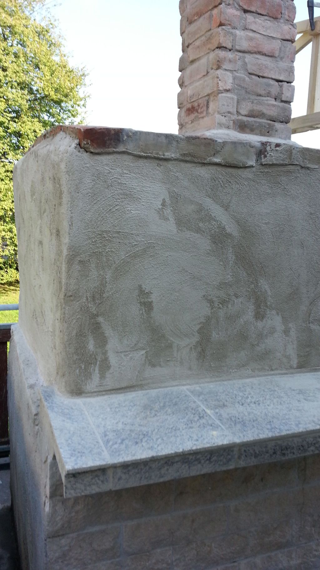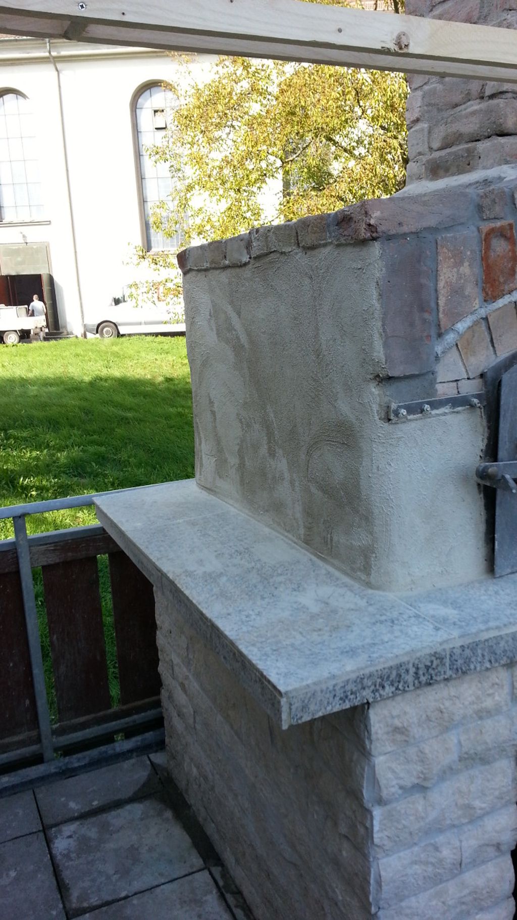 Seite nach Osten. Und Nord West. Beim abreiben wurde ich beobachtet von 2 Gipser gesellen die an der Kirche was zu tun hatten. Sie meinten das wäre gute Arbeit , ich könnte sie gerade vertreten und bei ihnen anfangen. Ich bin mit der Arbeit zufrieden und bin gespannt wie sich der Putz verhält wenn der Ofen warm ist , aber der Sockel am Haus wird ja auch sehr Warm und außerdem mache ich mir da keine Gedanken , an den alten Öfen waren auch Risse im Putz das gehört dazu. Später wird noch eine Außenwandfarbe darauf gestrichen und dann sehen wir weiter.