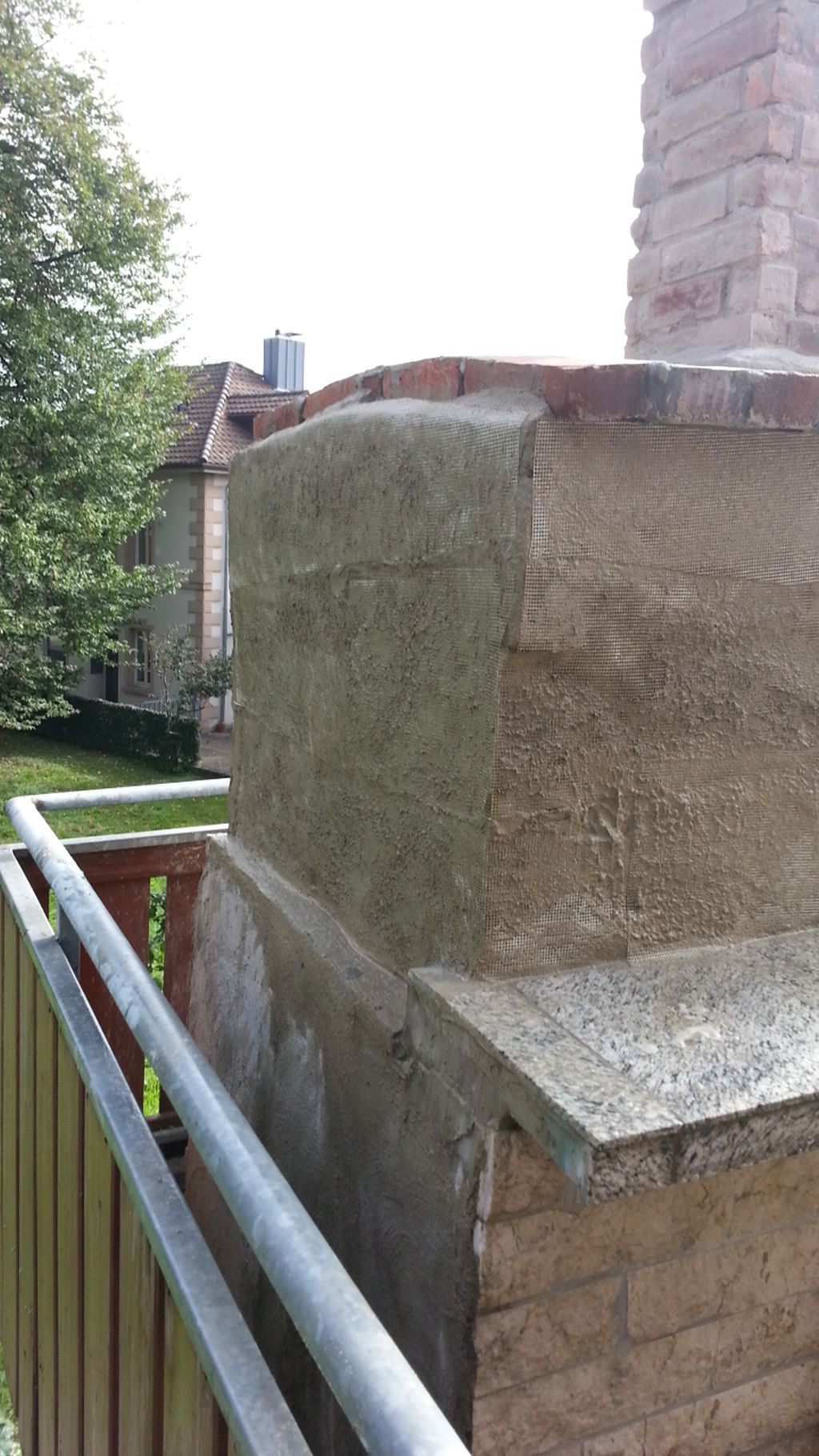 an unserem Solidaritäts- Feiertag kann ich leider nicht so viel machen, sonst werde ich wegen Feiertagsarbeit angeklagt, so kann ich euch wenigstens einen Bericht schreiben. Ich habe angefangen im Außenbereich , wo die unschönen Backsteine herausschauen, einen Sockelputz aufzutragen. Mit dem Sockelputz habe ich im unteren Bereich sehr gute Erfahrungen gemacht. An der Rückwand des Sockels wurde er schon verarbeitet, der zum Teil in zwei bis drei mal auftragen eine Stärke von bis zu Vier Zentimeter erreicht, der Putz ist schon gut ein Jahr drauf und war dem Wetter ausgesetzt. Das auftragen ging gut von statten . Ich habe auch zu besseren Stabilität ein Netz eingearbeitet, weil die Wand doch noch Handwarm wird, aber am Sockel am Haus dürfte es wärmer werden. Als nächstes die Seitenwand , die oberen Dachträger müssen noch mit dem Putz verdeckt werden. Ich wollte sie erst abschleifen , aber die Sauerei war mir doch zu groß . Auch die Rückwand. Unten seht ihr den alten Putz. Von der anderen Seite. So nun kann er antrocknen, wie ihr seht muss noch mehr aufgetragen werden.